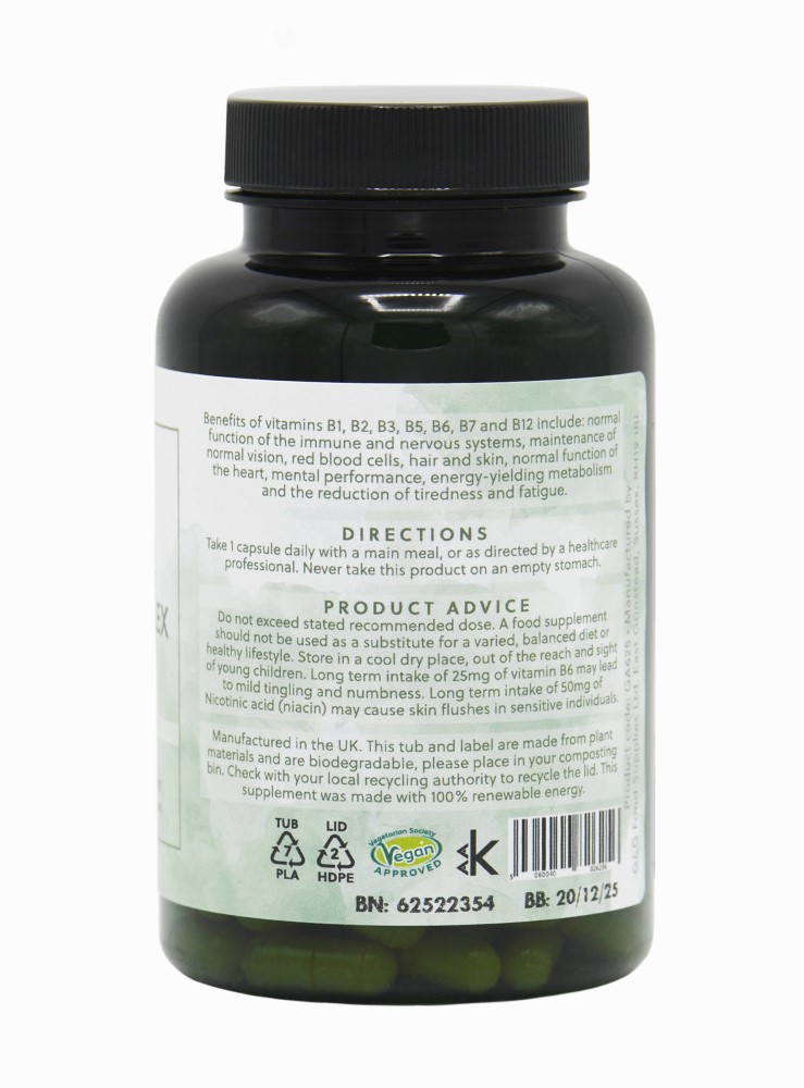 Inhalt: 120 KapselnEmpfohlene Einnahme: 1 Kapsel am Tag mit einer Mahlzeit Produktfakten Optimale Energieversorgung Vollständiger Vitamin-B-Komplex Perfekte Lösung für vegetarische und vegane Ernährung Stärkung des Nervensystems Fördert gesunde Haut und Haare Unterstützt die Herzgesundheit Verbesserte geistige Leistung und psysiche Gesundheit Vegan-freundlich und allergenfrei Verbesserte Stoffwechsel-Funktion Beschreibung Unser hochwertiges Vitamin B Komplex-Supplement bietet eine umfassende Mischung der essentiellen B-Vitamine, einschließlich der sechs nummerierten Vitamine (B1, B2, B3, B5, B6, B12). Dieses Produkt ist ideal für alle, die ihre Aufnahme der einzelnen B-Vitamine vereinfachen möchten, indem sie alle notwendigen Nährstoffe in einer praktischen Kapsel erhalten. B-Vitamine sind eine Gruppe wasserlöslicher Nährstoffe, die eine entscheidende Rolle in nahezu allen biochemischen Prozessen im Körper spielen. Besonders wichtig ist es, auf die Aufnahme von B-Vitaminen zu achten, wenn du eine Ernährung ohne Fleisch oder Fisch befolgst, da einige B-Vitamine, wie B12, hauptsächlich in diesen Lebensmitteln vorkommen. B-Vitamine tragen auf verschiedene Weise zu einer gesunden Ernährung bei. Die Vitamine B2, B3, B5, B6 und B12 unterstützen einen normalen Energiestoffwechsel und tragen zur Verringerung von Müdigkeit und Erschöpfung bei. Die Vitamine B1, B2, B3, B6, B12 und Biotin fördern die normale Funktion des Nervensystems. B2, B6 und B12 tragen zur normalen Erhaltung der roten Blutkörperchen bei, während B1 zur normalen Funktion des Herzens beiträgt. B1, B3, B12 und Biotin unterstützen die psychische Funktion, während B5 zur mentalen Leistung beiträgt. Warnhinweise Nur für Erwachsene.Während der Schwangerschaft, in der Stillzeit, bei Einnahme von Medikamenten oder Vorliegen von Erkrankungen bitte vor der Verwendung ärztlichen Rat einholen. Darf nicht in die Hände von Kindern gelangen.Produkt nicht verwenden, wenn die Versiegelung beschädigt ist.An einem kühlen, trockenen Ort aufbewahren.