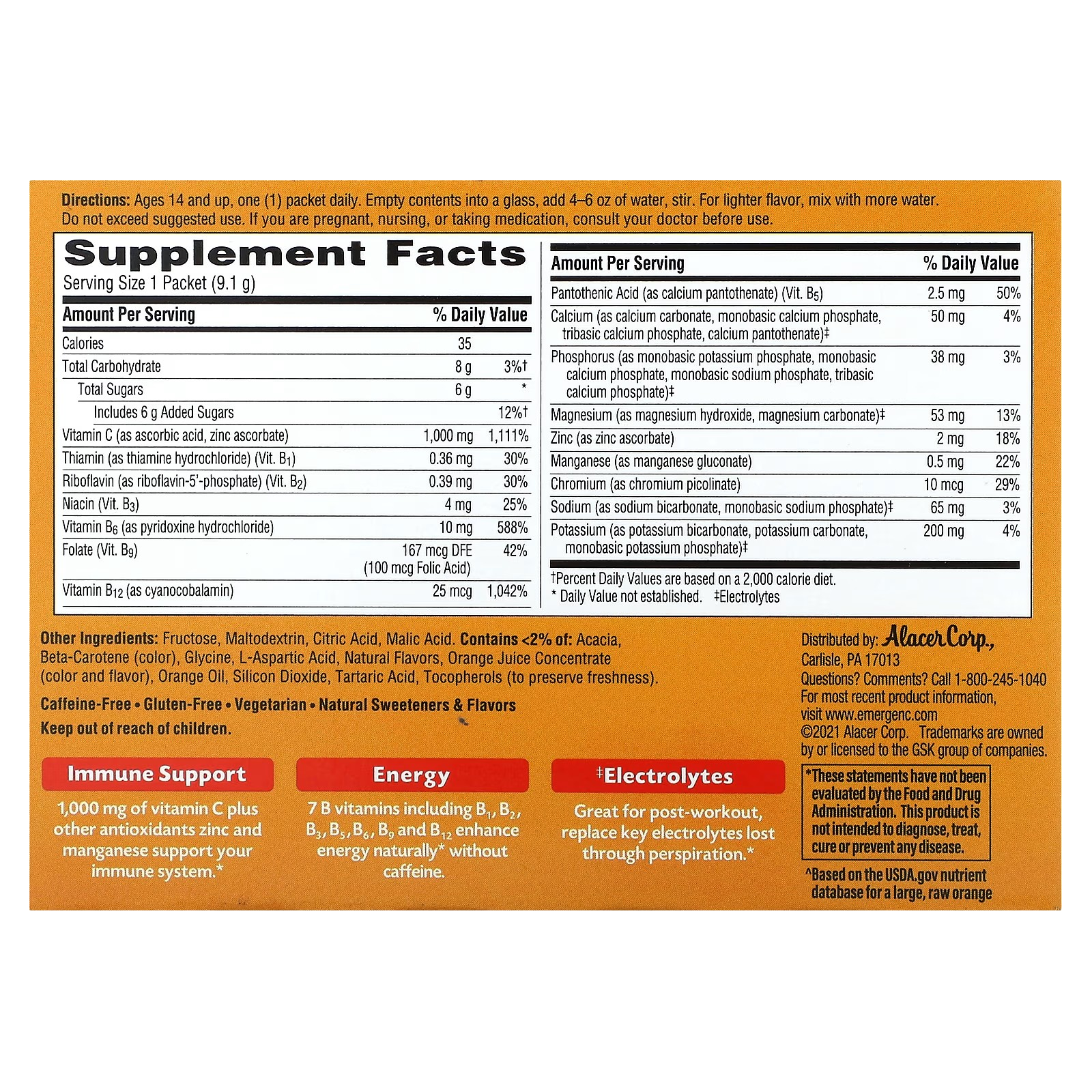 Genießen Sie die würzige, spritzige Note von Emergen-C, um Ihren Tag mit wichtigen Nährstoffen zu erfrischen. Das Brausegetränk enthält Vitamin C, Zink und Mangan zur Unterstützung des Immunsystems, sieben B-Vitamine für natürliche Energie sowie Elektrolyte, die besonders nach dem Sport oder bei starkem Schwitzen hilfreich sind. Emergen-C ist koffeinfrei, glutenfrei, vegetarisch und wird mit natürlichen Süßstoffen und Fruchtgeschmack hergestellt.